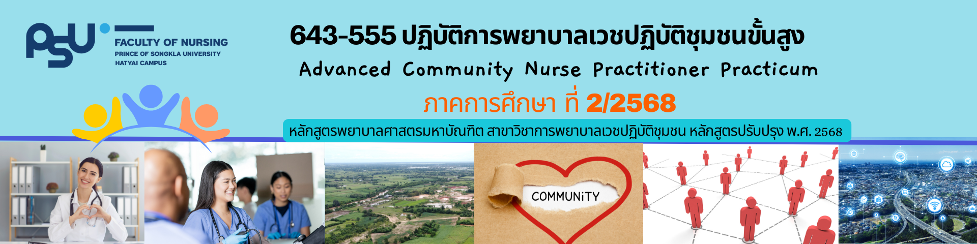 ปฏิบัติการพยาบาลเวชปฏิบัติชุมชน ในการประเมินภาวะสุขภาพ การวินิจฉัยปัญหา และการให้การพยาบาลแบบองค์รวมของบุคคล ครอบครัวและชุมชน การสร้างเสริมสุขภาพ การป้องกันโรค การดูแล และการฟื้นฟูสภาพ โดยครอบคลุมบุคคล ครอบครัว และชุมชน คนกลุ่มเปราะบาง เช่น ผู้สูงวัย กลุ่มด้อยโอกาส โดยยึดหลักการสร้างความเข้มแข็ง การมีส่วนร่วมของบุคคล ครอบครัว ชุมชน ทีมสหวิชาชีพ และภาคีเครือข่าย ที่บูรณาการแนวคิดและทฤษฎีทางการพยาบาล แนวคิดและทฤษฎีอื่น ๆ ที่เกี่ยวข้อง หลักฐานเชิงประจักษ์ การพัฒนาและ/หรือนำใช้นวัตกรรมทางการพยาบาลครอบครัวและชุมชน เทคโนโลยี ภูมิปัญญาท้องถิ่น การดูแลสุขภาพแบบผสมผสานและทางเลือก ความหลากหลายทางวัฒนธรรม หลักปรัชญาของเศรษฐกิจพอเพียง การถือประโยชน์ของเพื่อนมนุษย์เป็นกิจที่หนึ่ง และหลักจริยธรรมทางวิชาชีพ